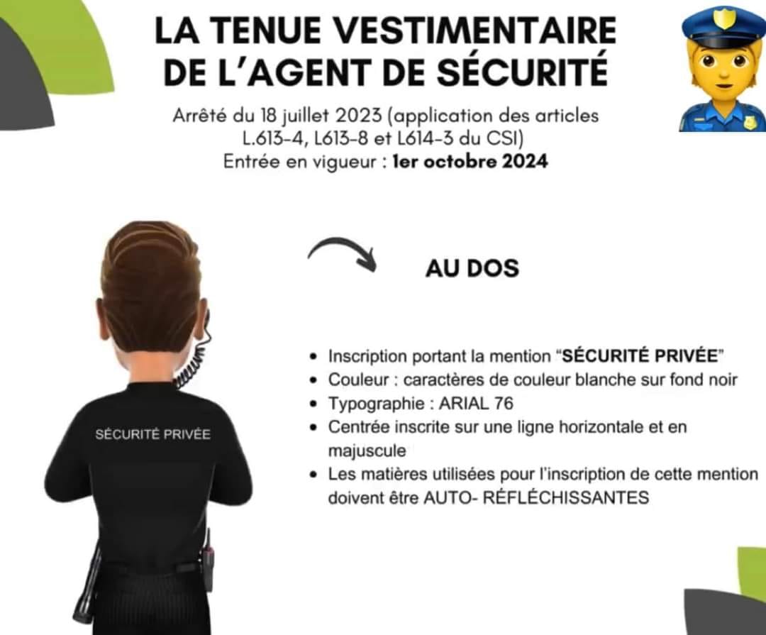 • Il doit comporter l’inscription obligatoire : « AGENT DE SÉCURITÉ PRIVÉE »