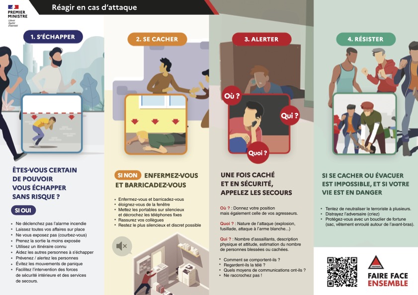 Réagir face à une attaque ( se cacher / se confiner / alerter / résister ou combattre)