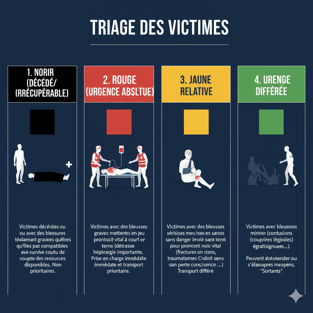 - Rouge: pour les victimes vivantes (hémorragie abondante pose de garrot)