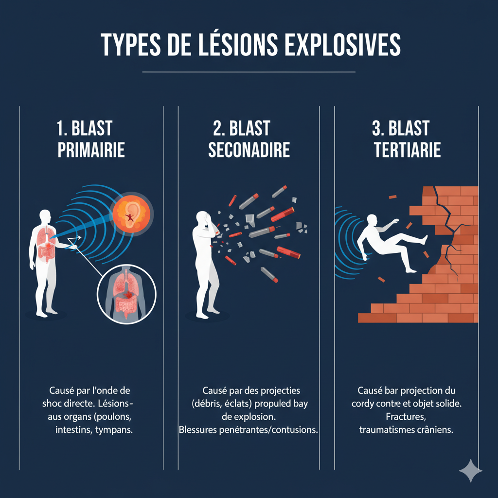 Le blast primaire est causé par l'onde de choc directe générée par une explosion. Cette onde de pression se propage à travers l'air (ou un autre médium) et peut provoquer des lésions internes graves aux organes creux, comme les poumons, les intestins et les tympans. Les tympans sont particulièrement vulnérables et leur rupture est un signe courant de blast primaire.