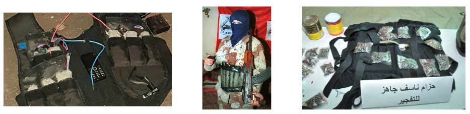 Ce sont des E.E.I qui sont utilisés dans le but de se faire exploser au milieu de la foule. Le système de mise à feu se fait manuellement par le porteur du gilet. Sur ces gilets et comme sur les autres E.E.I ont ragoûtera en plus de l’explosif des clous, billes d’acier, morceaux de lame de cutter, clous etc..